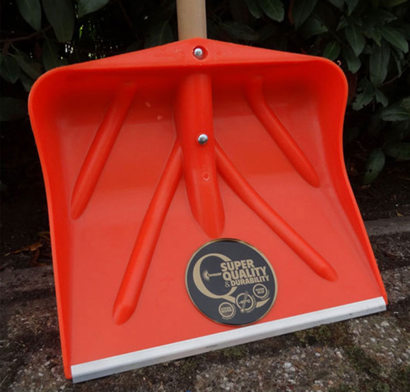 Sneeuwschuiver met een (vrijwel) onbreekbaar groot kunststof blad en een sterke houten steel.