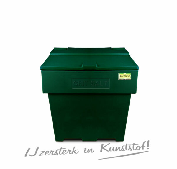 Kunststof zoutbak van donker geel kunststof (polyethyleen), met een inhoud van 170 liter.